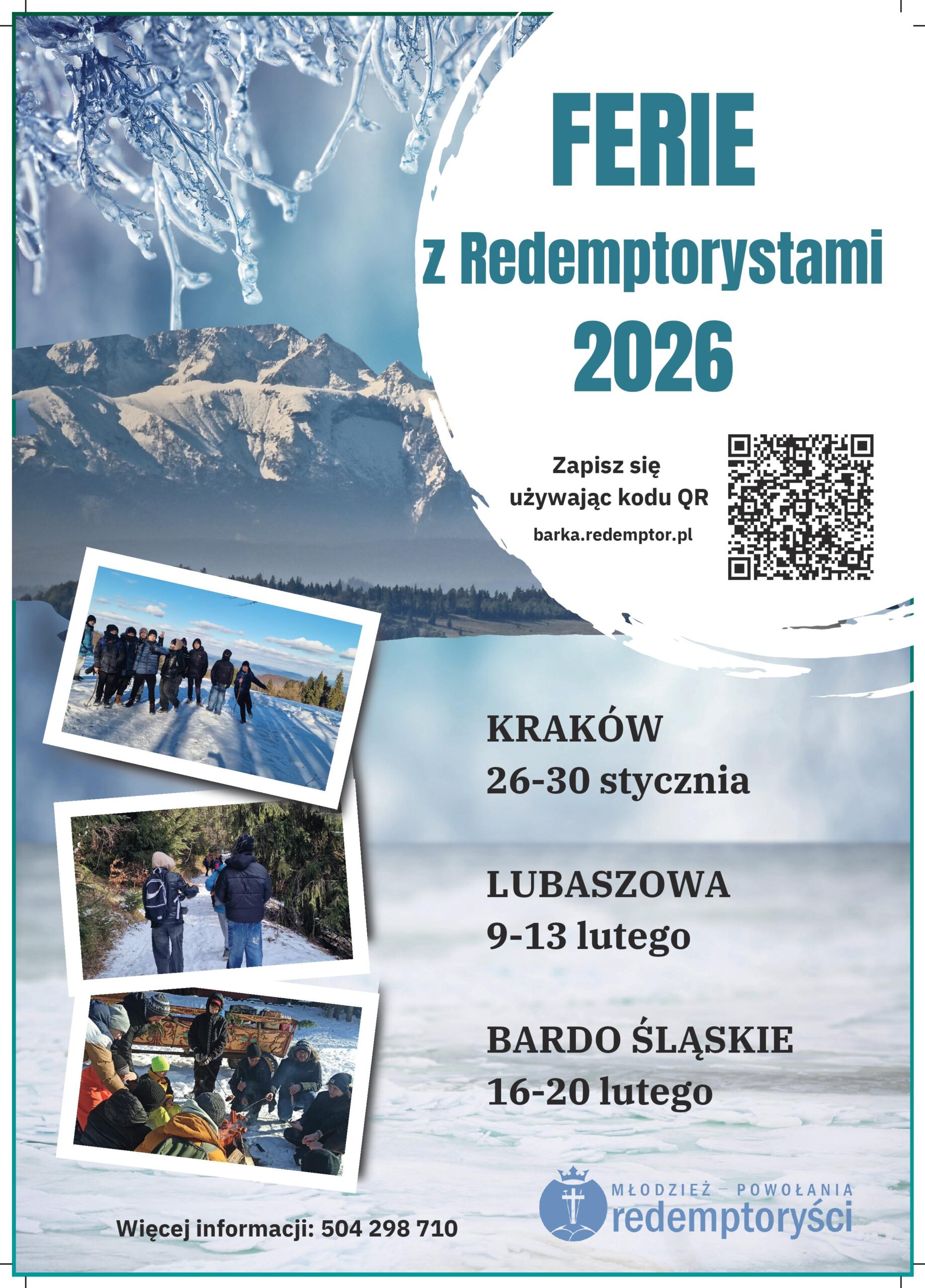Znamy już terminy i miejsca zimowych spotkań z redemptorystami w 2026. Zapraszamy na „FERIE Z REDEMPTORYSTAMI” do Krakowa, Lubaszowej k. Tuchowa i Barda!