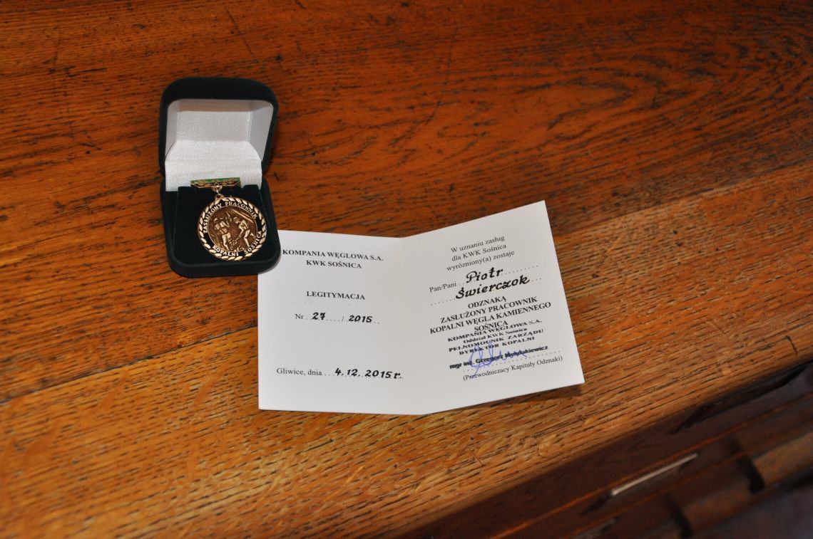Wręczenie medalu miało miejsce w niedzielę, 6 grudnia 2015 r. podczas uroczystej Eucharystii, celebrowanej w intencji górników z okazji ich patronalnego święta w Sanktuarium Matki Bożej Nieustającej Pomocy w Gliwicach. Dyrektor KWK „Sośnica”, pan mgr. inż. Grzegorz Mendakiewicz uzasadniając decyzję o wręczeniu medalu podkreślił stałą, wieloletnią, duszpasterską obecność o. Piotra Świerczoka wśród górników. Zwrócił szczególną uwagę na sprawowaną na terenie kopalni pod ziemią Eucharystię i wspólną modlitwę z górnikami, podczas strajku w obronie kopalni przed likwidacją w styczniu bieżącego roku.