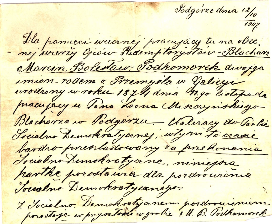 W kuli zainstalowanej 12 października 1907 r. znajdowały się także listy i wydawnictwa bliskie robotnikom, należącym do Polskiej Partii Socjalno-Demokratycznej Galicji i Śląska Cieszyńskiego, dołączone najprawdopodobniej bez wiedzy ojców, które także poniżej prezentujemy.