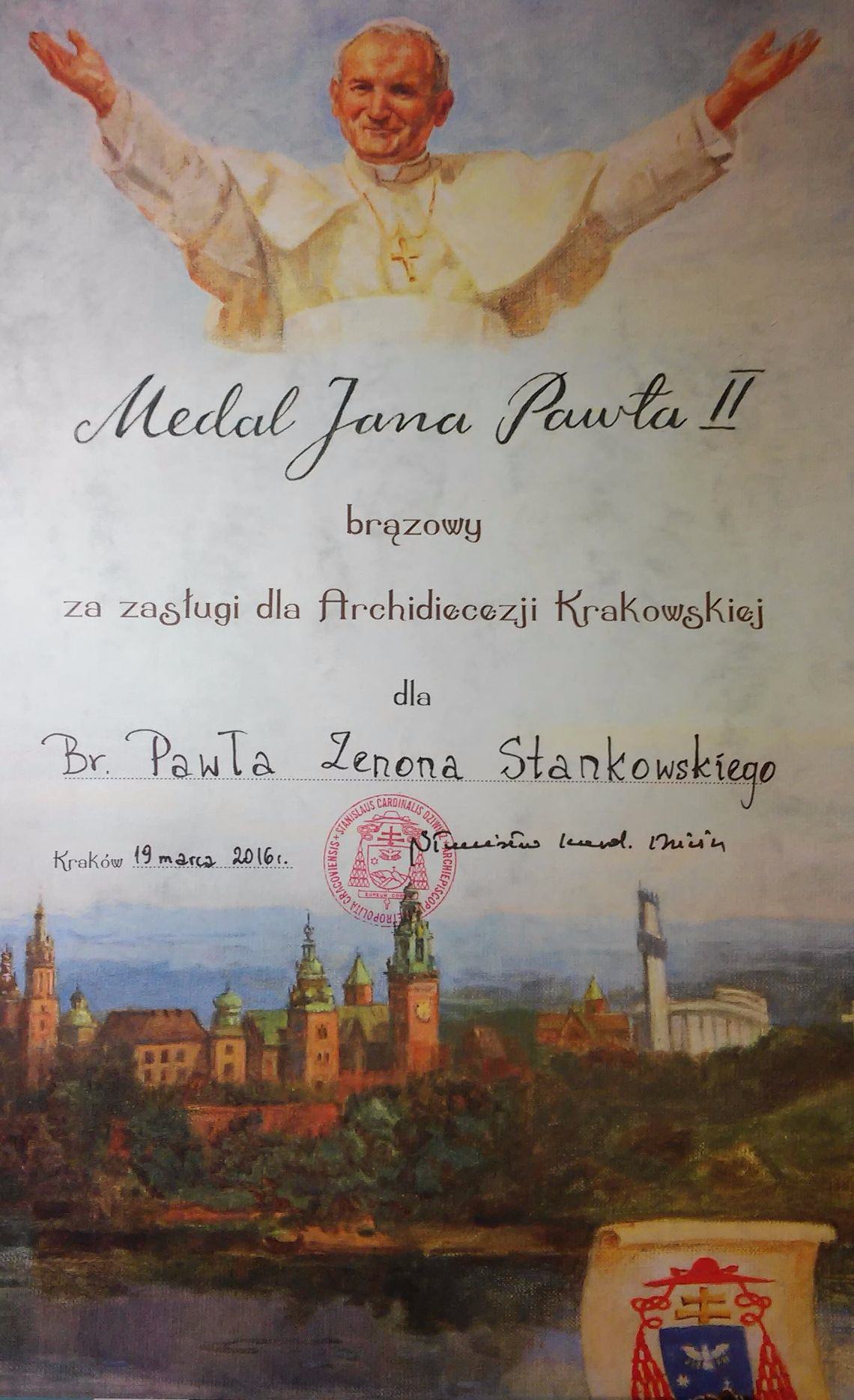 Brat Paweł, jako jedyny do tej pory w Archidiecezji Krakowskiej odznaczony tym medalem brat zakonny, otrzymał to wyróżnienie za posługę szafarza nadzwyczajnego Eucharystii i zasługi dla archidiecezji poprzez wieloletnią pracę w Krakowie.