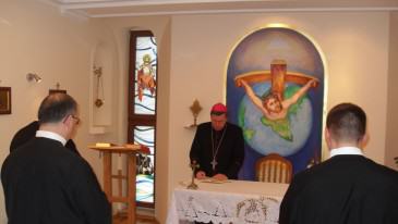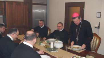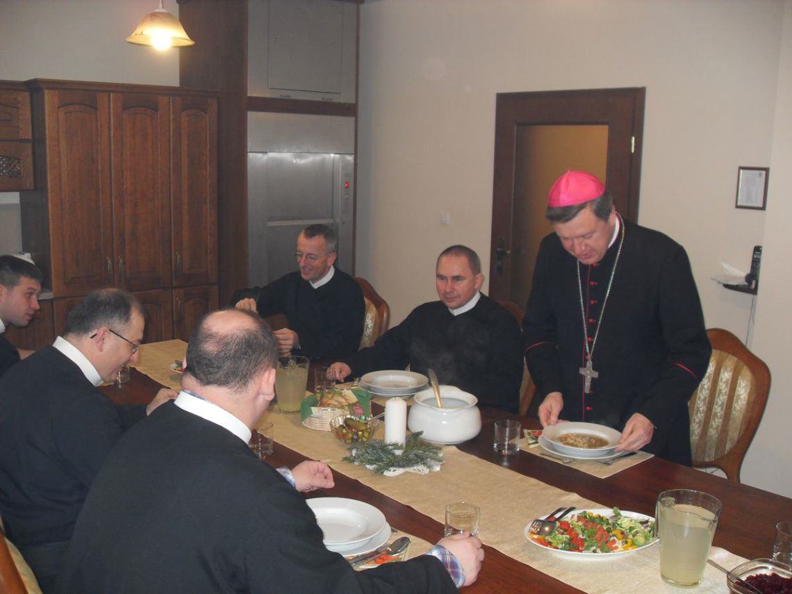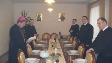 Spotkanie rozpoczęliśmy o godz. 13.00 od modlitwy południowej w kaplicy, a następnie ze śpiewem kolęd na ustach towarzyszyliśmy Księdzu Arcybiskupowi w poświeceniu naszych mieszkań. Wspólne kolędowanie zakończyło się w refektarzu, gdzie przy stole w bardzo braterskiej atmosferze mogliśmy się podzielić przemyśleniami na tematy związane z życiem Kościoła w Polsce, w Archidiecezji Wrocławskiej, a także dotyczącymi Zgromadzenia Redemptorystów. W rozmowie widoczna była wielka troskę Księdza Arcybiskupa o Kościół wrocławski, a zwłaszcza o młodzież i o zakony kontemplacyjne archidiecezji. Ksiądz Arcybiskup wyraził też nadzieję, że nasza wspólnota redemptorystów włączy się czynnie w Ewangelizację młodzieży w metropolii wrocławskiej.