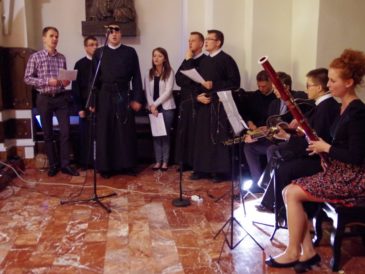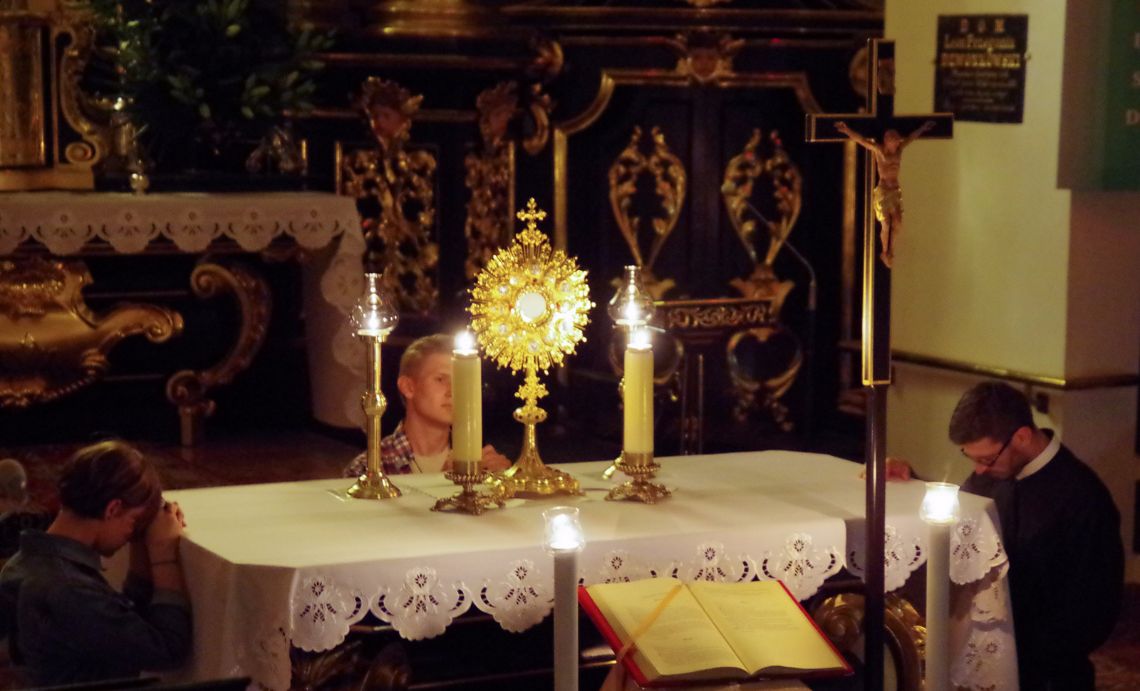 Po konferencji przyszedł czas na krótką przerwę w jadalni pielgrzyma przy ciastku i napoju. Skończywszy tę część naszego spotkania udaliśmy się do bazyliki i rozpoczęliśmy adorację Pana Jezusa w Najświętszym Sakramencie. Wspólnie śpiewając pieśni uwielbienia wysławialiśmy Tego, który nas zgromadził w ten piątkowy wieczór. On też daje każdemu z nas konkretne powołanie – niesienie miłości innym w każdym czasie: w wypełnianiu wszelakich, nawet najzwyklejszych obowiązków i zadań, których się podejmujemy. Niesamowite jest to, jak bardzo nas wszystkich uczestniczących w tym spotkaniu połączyło jedno przekonanie o miłości Boga do nas. Oby ta świadomość nie wygasła i była w nas zawsze obecna: gotowość w gotowości dążenia do poznania Boga i Jego miłości.