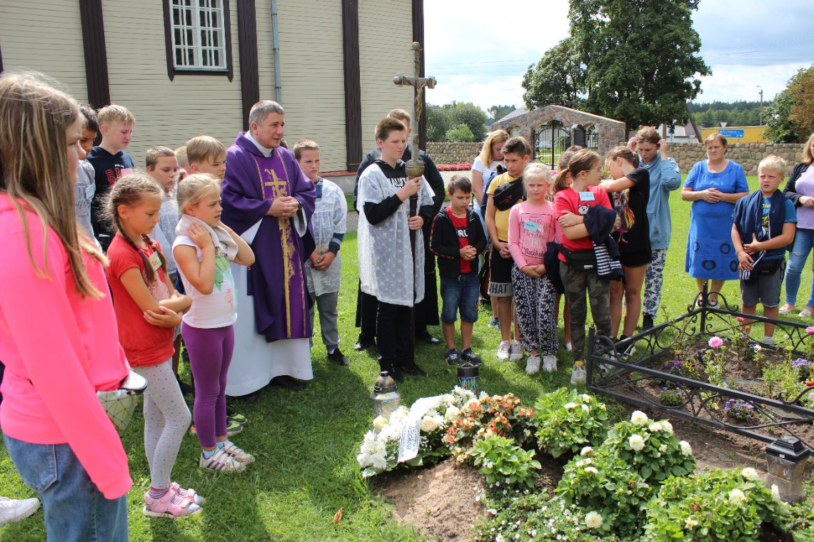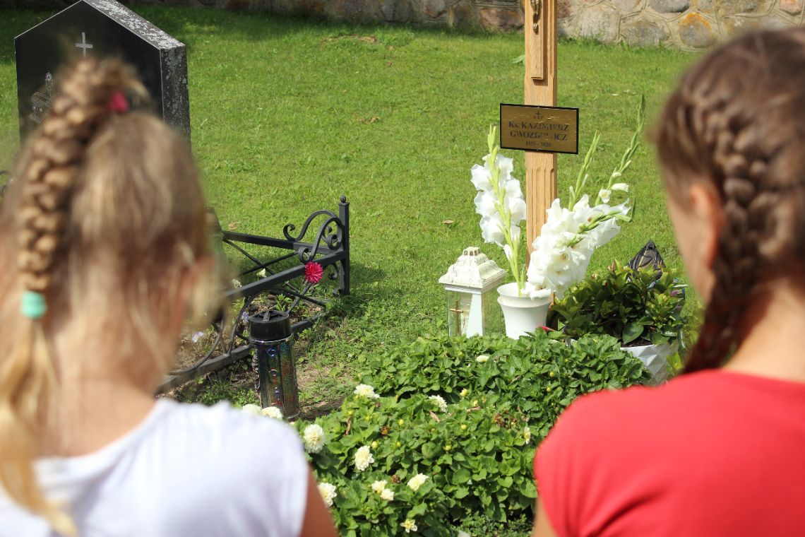 To właśnie ks. Kazimierz towarzyszył pierwszym momentom Zespołu, będąc proboszczem w parafii Widze na Białorusi. Grób ks. Kazimierza znajduje się na przykościelnym cmentarzu. Podczas rekolekcji została odprawiona Msza św. w intencji ks. Gwozdowicza, a po niej, procesyjnie udaliśmy się na grób, przy którym odmówiliśmy modlitwy i złożyliśmy wieniec z kwiatów.