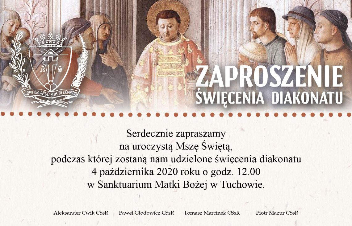 Już wkrótce nasi Bracia Alumni przyjmą święcenia diakonatu. Na uroczystość zapraszamy i prosimy o modlitwę za tychże naszych Współbraci oraz o nowe powołania do Zgromadzenia Redemptorystów.